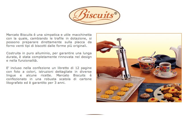 Abbiamo creato una macchina per rendere semplice, veloce e divertente la preparazione dei biscotti fatti in casa. Biscuits è la sparabiscotti che in pochi minuti ti permette di riempire un’intera teglia da forno di biscotti, in 20 diverse forme e 2 misure, da decorare a piacere. Con un design retrò, dei colori di tendenza e l’utilizzo di materiali all’avanguardia, Biscuits è accessorio utile e perfetto per arredare la tua cucina.