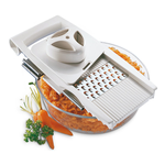 La grattugia universale 4 + 1 leifheit esegue tutte le operazioni necessarie in cucina per tagliare, grattugiare o affettare in modo veloce e con risultati perfetti. È possibile tagliare anche i pomodori senza problemi grazie all'inserto a v. Infatti gli spigoli di taglio inclinati della lama riducono la resistenza della pelle del pomodoro assicurando la creazione di fette assolutamente nette ed uniformi. Oltre al coltello da pomodoro, questo tuttofare offre una grattugia da verdura grossolana e fine, una grattugia per patate ed un coltello regolabile in altezza. Grazie ad una leva è possibile regolare la lama di taglio in modo da tagliare la verdura e la frutta a fette sottili e spesse a scelta. Gli inserti si inseriscono nel lato dell'alloggiamento per evitare di perderli. Un blocca-residui protegge le dita da eventuali lesioni ed assicura una valorizzazione ottimale.
