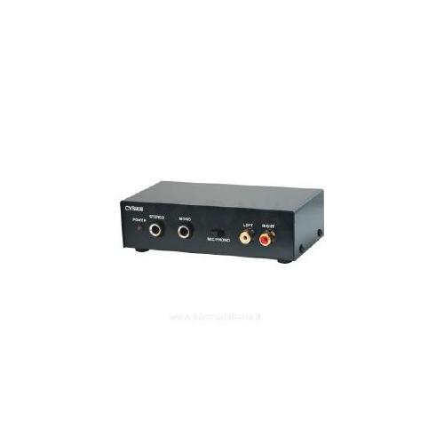 Convertitore di segnale audio. Consente di trasformare un segnale di tipo microfonico o "phono" in segnale di "linea". Ad esempio, nel caso in cui vogliate collegare un microfono ad un amplificatore stereo sprovvisto di apposito connettore, questo apparecchio farebbe al caso vostro evitando di dover acquistare un mixer.