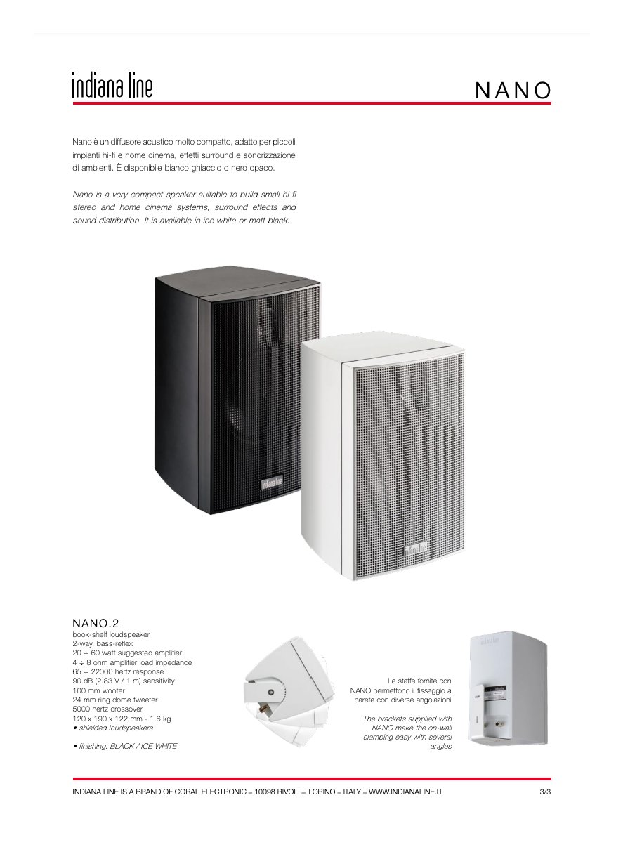Nano è un diffusore acustico molto compatto e versatile, adatto per piccoli impianti hi-fi, sistemi home cinema ed effetti surround, oltre che per la sonorizzazione di ambienti pubblici o privati. Può essere posizionato su un ripiano o fissato ad una parete: la staffa metallica inclusa nella confezione permette una facile installazione a muro con diverse angolazioni.