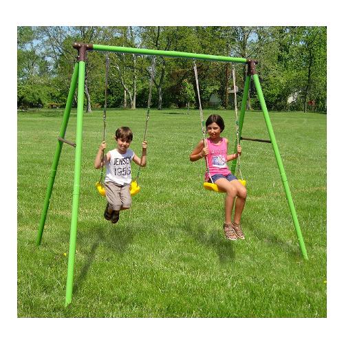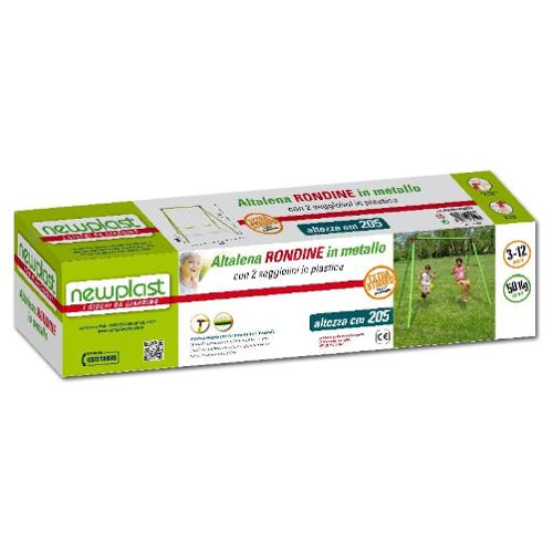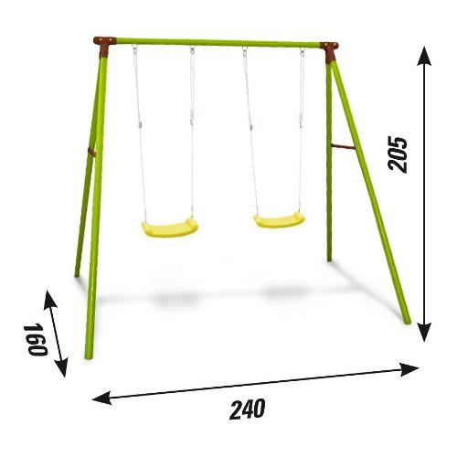 Altalena doppia in altezza 205 cm con montanti da 51 mm tondi; barra portante 51 mm e giunti di assemblaggio in metallo. Completo di seggiolino in plastica. I picchetti per il fissaggio a terra e la messa in sicurezza dell'altalena sono inclusi nel kit