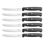 Coltello da tavola a punta arrotondata con dentatura speciale larga e delicata. Profilo della lama e dentatura disegnati appositamente per tagliare tutti i cibi cotti e crudi e sbucciare la frutta sulla tavola.