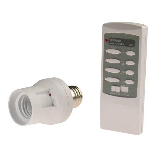 Portalampada E27 230V telecomandato Acquisisce automaticamente le frequenze del telecomando (fino a 6 codici). Potenza massima disponibile: lampade fluorescenti: 60W, lampade a incandescenza 100W. Telecomando per attivare/disattivare il portalampada a distanza; può controllare anche altri 15 dispositivi oltre a quello incluso nel kit. Alimentato da batteria 23A 12V (inclusa). Distanza massima tra portalampada e telecomando: 30m
