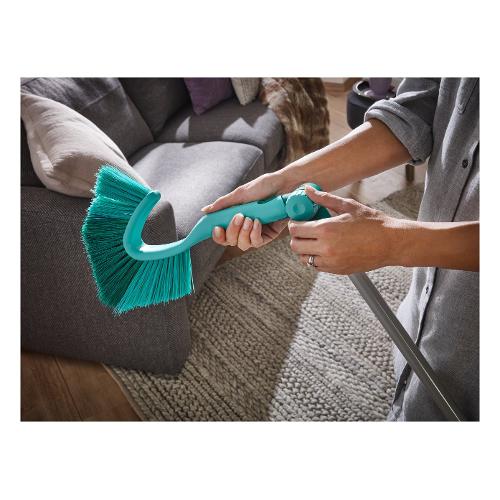 La scopetta da polvere e pareti dusty mette la parola fine agli sgradevoli accumuli polvere che provocano problemi particolari agli allergici. La sua speciale forma triangolare raccoglie da tutti gli angoli lo sporco e la polvere, mentre il suo snodo consente la regolazione delle più svariate angolazioni di pulizia. È possibile inclinare lo snodo molto flessibile in modo da riuscire a pulire senza difficoltà e con efficacia anche i punti difficilmente accessibili, come ad esempio i telai delle porte e le superfici degli armadi. Per queste operazioni è sufficiente estrarre il manico telescopico fino a raggiungere la lunghezza desiderata e fissare l'angolazione utile nello snodo. A questo punto è possibile inserire la scopetta per pareti e polvere dusty anche dietro l'asta delle tende grazie al suo nuovo design. È possibile estrarre il manico telescopico fino a raggiungere una lunghezza utile compresa tra 1,40 e 2,20 metri. In questo modo la scopetta da polvere e pareti dusty è adatta anche agli ambienti dei vecchi edifici o alle facciate caratterizzati da grandi altezze. Infatti l'altezza utile raggiunge un ragguardevole valore di 3,70 metri con la massima estensione del manico. Se è necessaria una scopetta manuale, si può contare anche su dusty. Ruotando il manico telescopico dusty si trasforma in un pratico strumento maneggevole.