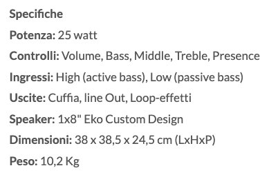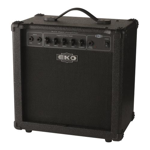 L'amplificatore per basso B 25 nasce dalla collaborazione fra Eko Guitars e il genio tecnico di Roberto Tittarelli che danno vita ad un prodotto con un ottimo rapporto qualità-prezzo e un'ottima verstilità timbrica. Due ingressi, attivo e passivo, cono da 8" e 25 Watt di potenza.
