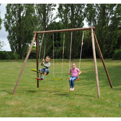 Altalea in legno trattato autoclave con montanti diametro 80 e barra portante diametro 100. Giunti in metallo con meccanismi brevettati di aggancio. Sedute in plastica rigida e cavalluccio con sostegni in metallo.