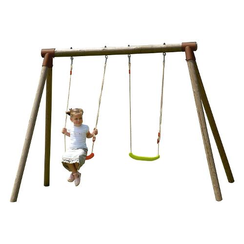 Altalena doppia in altezza 190 cm con struttura in legno trattato in autoclave. Montanti (ø 80 mm) e barra portante (ø 100 mm) in legno. Giunti di assemblaggio brevettati in metallo e seggiolino in plastica robusta. I picchetti per il fissaggio a terra e la messa in sicurezza dell'altalena sono inclusi nel kit