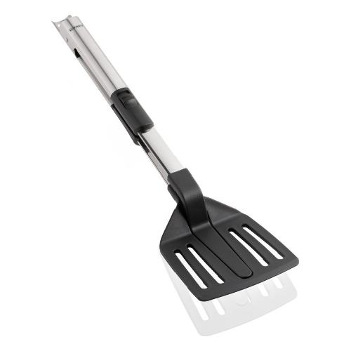La spatola con pinze di leifheit 2 in 1 è esattamente lo strumento necessario per gli arrosti. Ad esempio, è una spatola stabile per girare le bistecche. E nel giro di pochi secondi si trasforma in una pinza per servire le pietanze in modo sicuro. Il meccanismo di bloccaggio di nuova concezione rende il tutto possibile. È sufficiente sbloccare il meccanismo con il pollice per trasformare la spatola in pinza. L'estremità delle pinze è realizzata in nylon elastico resistente fino ad una temperatura di 160°c che non lascia graffi nemmeno nelle padelle rivestite in teflon. L'impugnatura in acciaio inox risulta gradevole e stabile in mano