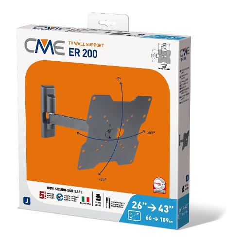 ER200 è un supporto con braccio adatto a tutte le TV con foratura VESA 75-100-200 mm, il braccio consente di allontanare lo schermo dalla parete ed inclinarlo verticalmente ed orizzontalmente fino a 45° (dipende dalle dimensioni della TV).