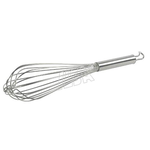 Frusta professionale cucina con 8 fili, realizzata in acciaio inox 18/10. Lunghezza di 25 cm, senza anello raccogli fili. Lo spessore del filo di 2,3 mm rende questo strumento particolarmente indicato per la preparazione di impasti duri. Tutte le fruste sono fornite di un pratico gancio per appenderle e hanno il manico resistente alle infiltrazioni di acqua o ai residui di cibo, grazie ad una guaina in resina che ricopre l'innesto dei fili. La frusta professionale cucina si usa per mescolare composti duri, potrebbe venire sostituita dallo sbattitore elettrico o dal frullatore, tuttavia molti cuochi ritengono che il movimento manuale sia indispensabile a garantire la delicatezza di molte preparazioni e che non possa venire rimpiazzato da strumenti elettrici. La sua forma tondeggiante aumenta la superficie di lavorazione e il numero elevato di fili garantisce ottimi risultati.
