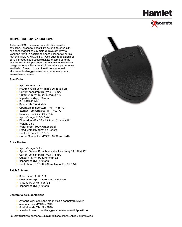 Antenna GPS universale per antifurti e ricevitori satellitari.Il prodotto è costituito da una antenna GPS con base magnetica e 5 metri di cavo schermato. Vengono forniti in dotazione anche i connettori di tipo maschio MMCX, MCX e SMA.Con questa dotazione di serie il prodotto può essere utilizzato come antenna esterna opzionale per quasi tutti i sistemi di antifurto o navigazione satellitare dotati di connettore per antenna ausiliaria. I 5 metri di cavo forniti, consentono di effettuare il cablaggio in maniera perfetta anche su autovetture e camion.