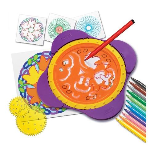 Con Spirogiro puoi creare facilmente fantastici disegni circolari, altrimenti difficili da realizzare, utilizzando solo 3 diversi tipi di strumenti inclusi nella ricca confezione: con i piccoli ingranaggi gialli, infatti, puoi realizzare sorprendenti grafiche a spirale sempre diverse; con l’ingranaggio blu si realizzano magnifici disegni geometrici circolari; con la sagoma arancione, infine, si disegnano bellissime composizioni stile Mandala ogni volta differenti e sorprendenti