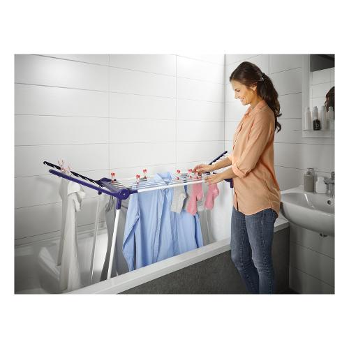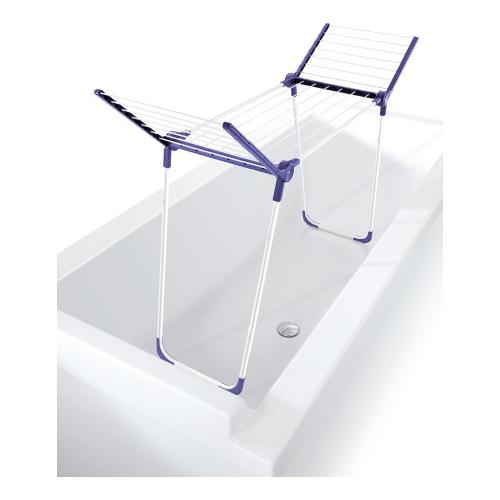 Stendibiancheria da appoggio con battenti leifheit pegasus 120 solid compact per pavimento e per vasca da bagno . Ideale per essere usato all'aperto come anche all'interno. Perfetta adattabilità alle comuni vasche disponibili in commercio. Solo 44 cm di profondità le alette con un'altezza di 93 cm da terra sono apribili lateralmente e consentono anche l'asciugatura di capi di bucato lunghi