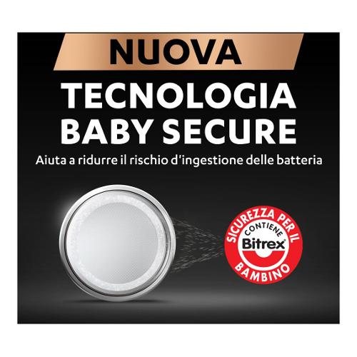 Tecnologia Baby Secure: per scoraggiarne l'ingestione da parte di neonati e bambini, il retro della batteria è ricoperta da Bitrex, una sostanza non tossica, ma amarissima e disgustosa.