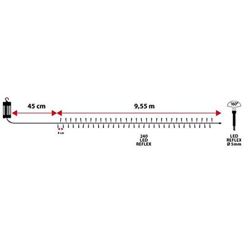 Catena lineare tl 240 led bianco ø5mm reflex, memory controller integrato nel porta batterie luce fissa + 7 giochi di luce selezionabili + off, timer on-off 8-16 ore, a batteria 4xaa 1,5v, uso esterno, cavo verde, dimensioni 0 , 5 + 9,6m, scatola lusso color (xkc art. Tl 240-ct 4aa).