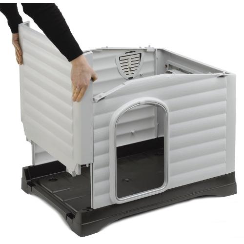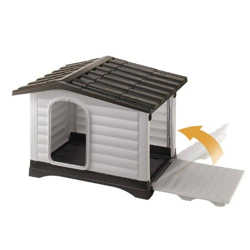 Dogvilla è una cuccia per cani da esterno dotata di sistema di apertura della parete laterale (brevettato). Il pannello apribile si può montare a scelta su fianco destro o sinistro; una volta aperto diventa una pratica padana che si appoggia sul terreno e consente al cane di avere tanto spazio in più per sè. Ideale per qualsiasi stagione dell'anno, dogvilla è dotata di sistema di ventilazione e di drenaggio dell'acqua che garantiscono un ambiente sempre asciutto: la particolare costruzione del fondo presenta delle apposite fessure per consentire il defluire dell'acqua verso l'esterno della cuccia. Appositi profili in alluminio intorno alla porta d'ingresso sono stati pensati in modo da resistere ad eventuali morsi del cane. Dogvilla è venduta completamete smontata per ridurre il più possibile il volume dell'imaballo. Il montaggio è estremamenete semplice e non richiede strumenti particolari. Questo la rende trasportabile e utilizzabile anche in vacanza