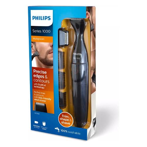 Philips MULTIGROOM Series 1000 ti consente di rifinire, regolare e radere i peli del viso. Rifinisci e regola la tua barba in modo uniforme con i rifinitori e i pettini DualCut avanzati. Definisci linee e contorni con il rasoio di precisione. Completamente lavabile, batteria AA. Regolazione altezza taglio da 1 a 5mm