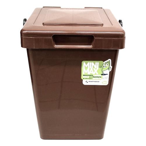 Pattumiera minimax 25 lt marrone. 100% riclicabile. Coperchio sagomato per la sovrapposizione. Manico ergonomico con dispositivo blocca coperchio. Presa ergonomica sul fondo per facilitare lo svuotamento. Made in italy