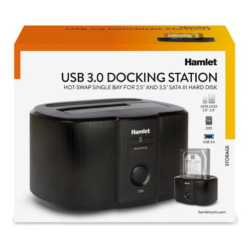 Hamlet USB 3.0 Docking Station offre un modo rapido e semplice per collegare un disco SATA da 2,5" o 3,5" alla porta USB del computer senza bisogno di installare il disco all'interno del PC o in un box esterno. Grazie alle funzioni Plug and Play e Hot-Swap, basta inserire l'hard disk nella docking station per accedere velocemente ai dati o aumentare la capacità di archiviazione del computer. Il collegamento USB 3.0 offre una velocità di trasferimento dati fino a 5Gpbs e la funzione OTB (One Touch Backup) permette di avviare il backup con la sola pressione di un tasto.