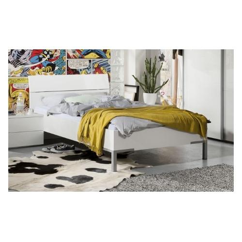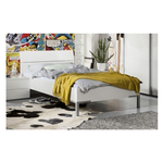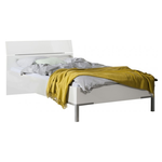 Letto una piazza e mezzo laccato bianco della linea Gran Privilegio, per una camera da letto dal carattere moderno, giovane e luminoso. La robusta struttura spessa 25 mm presenta all'interno due fasce di sostegno per l'appoggio della rete a doghe senza piedi e del materasso La testiera leggermente inclinata poggia direttamente a terra, mentre la pediera è costituita da due longilinei piedi in metallo.