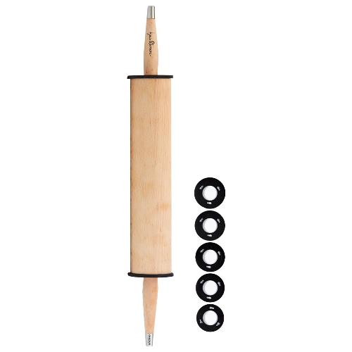 Mattarello girevole con spessori regolabili la pasticceria di precisione iginio massari. Corpo e impugnatura in legno di faggio al naturale (senza trattamenti), con 5 anelli intercambiabili in dotazione per tirare con la massima precisione e in maniera uniforme qualsiasi tipo di pasta. Gli anelli montati sul matterello sono utili per tirare più facilmente paste di differente consistenza. Sistema a scatto per il cambio degli anelli, realizzati in pom (poliossimetilene/acetalica).