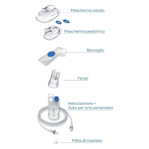 L'inalatore con tecnologia ad aria compressa mediante compressore consente il trattamento delle malattie delle vie respiratorie. Grazie al tempo di inalazione breve il trattamento risulta piacevole. Potenza di nebulizzazione: ca. 0,3 ml/min