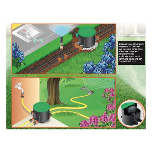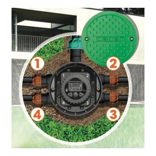 Pozzetto premontato integrato di programmatore.Permette Di aprire e chiudere fino a 4 linee indipendenti d’irrigazione interrata o a goccia. Facile programmazione, con soli 3 tasti e un grande display. Irrigazione da 1 a 60 minuti. 2 programmi per ciascuna uscita, fino a 8 cicli di irrigazione al giorno. Impostazione settimanale con esclusione dei giorni. Funzione manuale test 5 minuti, modificabile come i tempi d’irrigazione. Tenuta stagna ip68: il più alto grado di sommergibilità. Coperchio di protezione e tasti in gomma bimateriale. Permette di visualizzare i programmi inseriti per ogni unità e di effettuare cancellazioni. Attacchi 3/4” m (20 - 27 mm) sia di entrata che di uscita. Collegabile a sensore rain sensor in radiofrequenza. 5 tappi filettati in dotazione per le uscite non utilizzate. 4 solenoidi bistabili. Portata delle linee: max 25 l/min a 2,5 bar. Pressione di esercizio: min 1 - max 6 bar. Temperatura di esercizio: 3° - 60°.