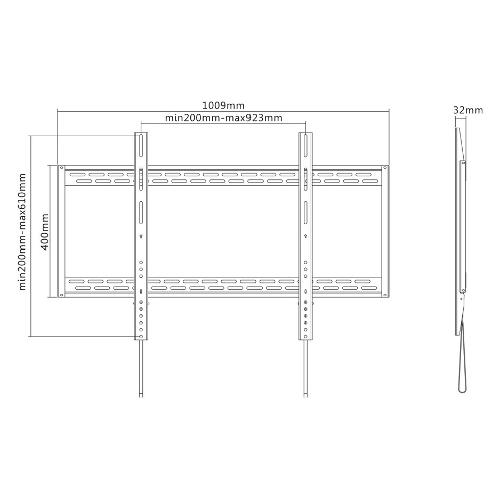 Il LFD-W1000, adatto a schermi fino a 100" (254 cm) con capacità massima di trasporto di 125 kg può essere montato su schermi con fori VESA fino a 900x600. Questo prodotto ha inoltre un potenziale sistema di bloccaggio tramite lucchetto (non incluso) ma facilmente acquistabile in un negozio di ferramenta o simile. La facile installazione consente di montare la striscia orizzontale sulla parete e i due ganci sul retro dello schermo.