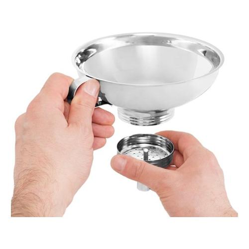 Imbuto in acciaio inox 2 in 1 doppia funzione ideale per liquidi e marmellate. Collo svitabile e filtro incluso, diamentro 15 cm