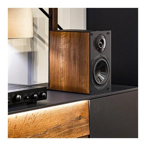 Diffusore acustico da scaffale equipaggiato con woofer da sei pollici con cono in polipropilene iniettato e tweeter al neodimio con cupola in seta trattata e camera di risonanza posteriore a ventilazione radiale. Per interfacciare correttamente il suono con l’acustica dell’ambiente, è possibile controllare il livello delle basse frequenze, inserendo nel condotto reflex posteriore il tampone di spugna in dotazione: solitamente quando il diffusore è collocato in una nicchia.