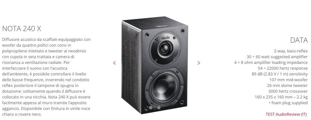 Diffusore acustico da scaffale equipaggiato con woofer da quattro pollici con cono in polipropilene iniettato e tweeter al neodimio con cupola in seta trattata e camera di risonanza a ventilazione radiale. Per interfacciare il suono con l’acustica dell’ambiente, è possibile controllare il livello delle basse frequenze, inserendo nel condotto reflex posteriore il tampone di spugna in dotazione: solitamente quando il diffusore è collocato in una nicchia. Nota 240 X può essere facilmente appeso al muro tramite l’apposito aggancio.