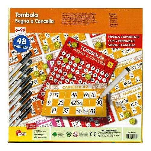 Il più classico dei giochi delle feste in un’originale versione che utilizza 48 cartelle e speciali pennarelli cancellabili per segnare i numeri estratti. Tabellone, 90 pedine, 9 pennarelli cancellabili, sacchetto per i numeri e cancellino inclusi