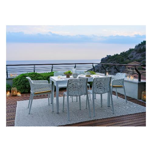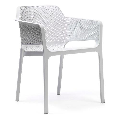 Raffinato relax per Net, monoscocca in resina fiberglass accuratamente bucherellata con un motivo a fori quadrati e raggiati distribuiti in continuità sulla superficie tridimensionale della seduta
