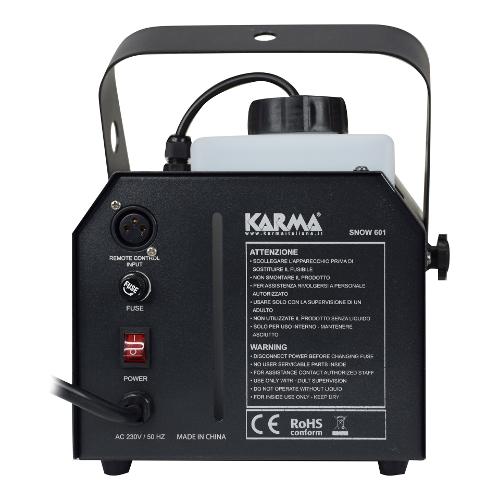 Snow machine in grado di ricreare l'effetto neve. L'effetto straordinario è ottenuto grazie ad una leggerissima schiuma che si dissolve dopo aver toccato il terreno. In sospensione, essa risulta simile a fiocchi di neve. Se utilizzata all'aperto i fiocchi, trasportati dal vento, appariranno ancora più simili ad una vera nevicata e copriranno una zona ancora più ampia. Il serbatoio è in grado di ospitare fino a 1 lt di apposito liquido. Comando wireless in dotazione per il controllo a distanza liberi da cavi di collegamento.