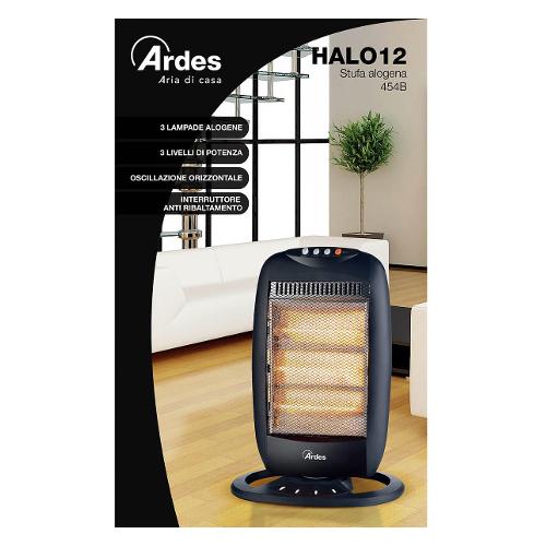 Stufa alogena con 3 elementi riscaldanti. 3 livelli di potenza selezionabili individualmente: 400/800/1200W. Oscillazione orizzontale.
