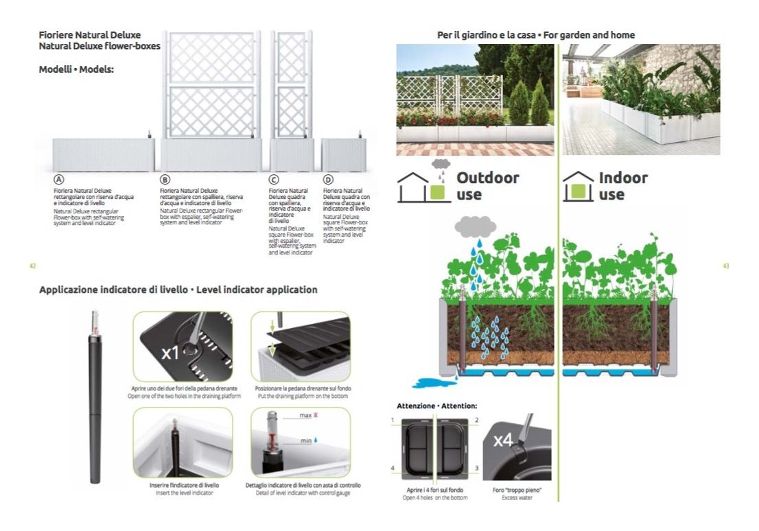 Fioriera natural deluxe è un sistema versatile e modulare per organizzare e arredare gli spazi – indoor e outdoor – con il verde. E' perfetta per racchiudere e creare angoli e quinte fiorite; dotata di riserva d'acqua e indicatore di livello.