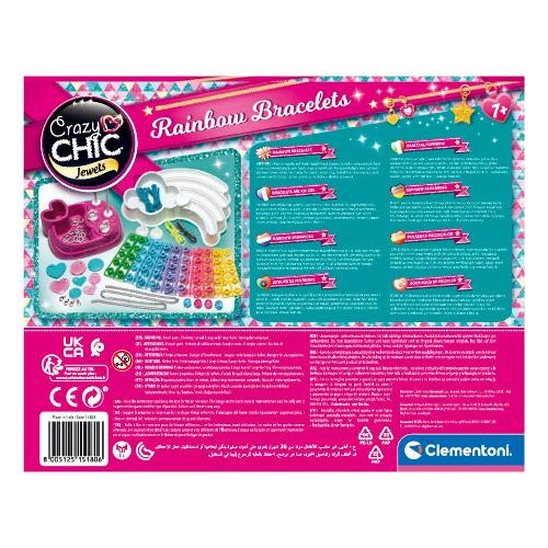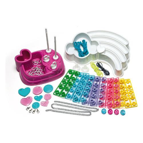 Un kit esclusivo per realizzare creazioni uniche ed essere sempre alla moda! Il gioco contiene 100 anellini in plastica colorata, altri con finitura metallica, cordini elastici e catenine da assemblare per creare bracciali glamour! Con pratico strumento per infilare facilmente gli anellini! Per realizzare gioielli con effetto multicolor in tantissime combinazioni diverse!