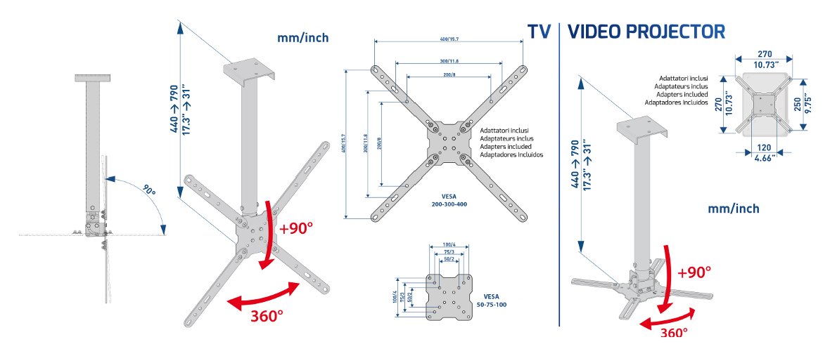 Il supporto da soffitto multifunzione SLIMSTYLE 400 CE, grazie agli adattatori inclusi, è utilizzabile sia con TV dai 14 ai 65” che con i videoproiettori