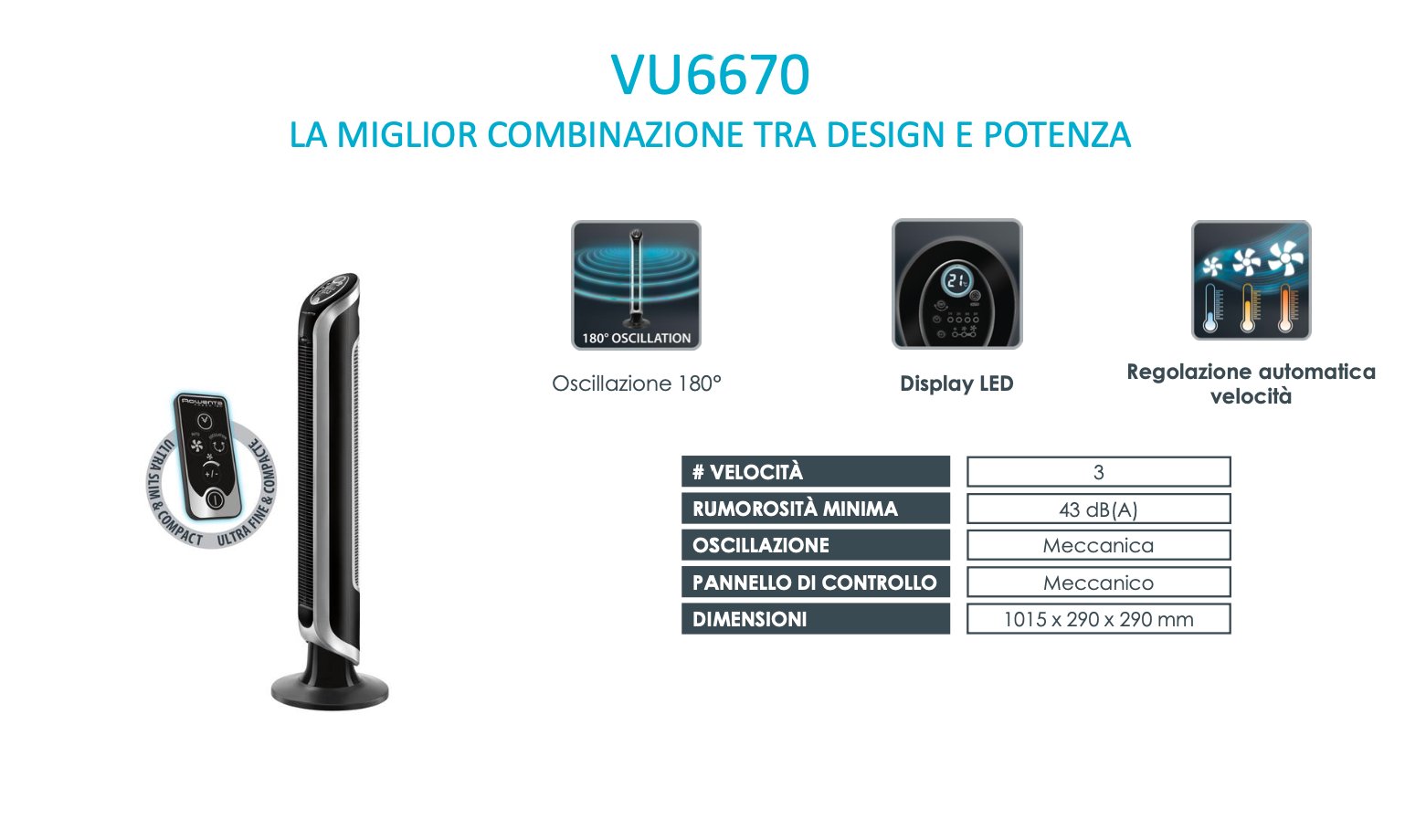 Mantieniti sempre fresco con stile, grazie al ventilatore a torre digitale che offre comfort e prestazioni elevate. La sua tecnologia di oscillazione a 180° garantisce una sensazione rinfrescante in tutta la stanza, azionata dal flusso d'aria potente e dall’ampia diffusione dell'aria. Goditi un effetto di raffreddamento personalizzato grazie a 3 velocità di aria regolabili che si adattano ad ogni tua esigenza, oltre a una serie di comode funzionalità. Facile da pulire e da mantenere, il suo design alto e sottile si inserisce elegantemente in qualsiasi spazio e interno.