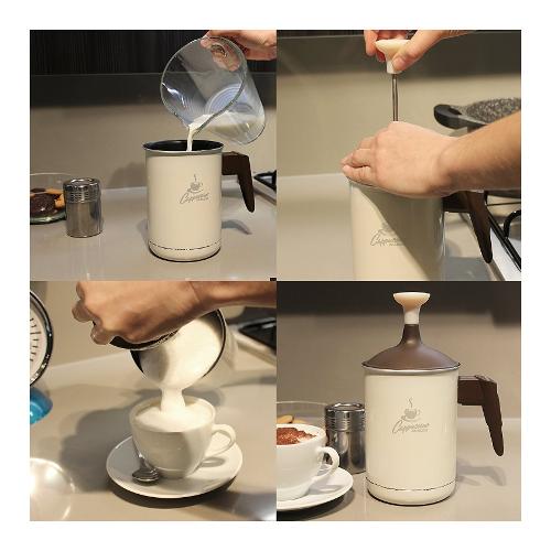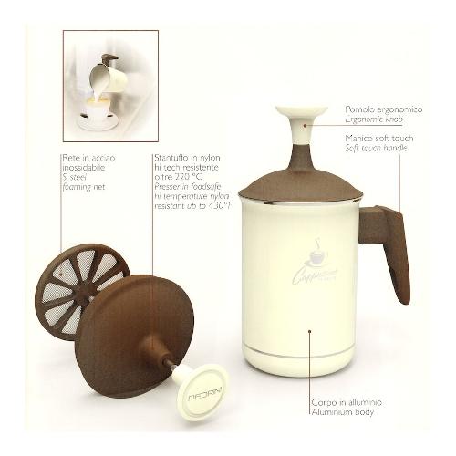 Montalatte cappucinatore con doppia rete in acciaio inox, per montare il latte ancora più velocemente. Manico soft touch