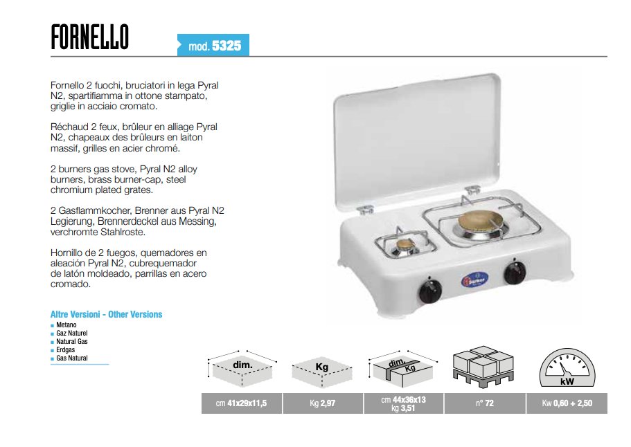 Fornello 2 fuochi, bruciatori in lega Pyral N2, spartifiamma in ottone stampato, griglie in acciaio cromato.