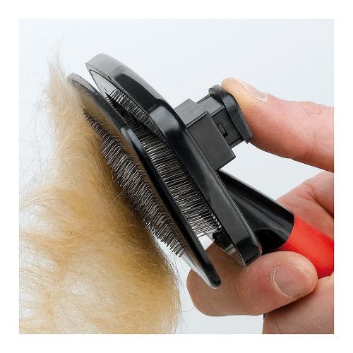 Specifica per la cura del sottomanto, gro 5956 è una spazzola cardatore per cani dal pelo medio e lungo. Estremamente efficace nella rimozione del pelo morto, è dotata di filetti in acciaio inox che determinano un'azione profonda ma senza irritare la cute o creare eccessivo fastidio per l'animale. La particolarità di questo accessorio è l'estrema praticità data dal meccanismo che consente di rimuovere velocemente il pelo raccolto dal cardatore, premendo il pulsante dietro la testina. Inoltre, il manico in plastica con impugnatura in gomma antiscivolo rende la spazzola molto comoda da maneggiare. Accessorio perfetto per l'abituale toelettatura del vostro amico a quattro zampe, GRO 5956 è uno strumento ideale per aiutare a mantenere la pelliccia sempre morbida e in salute, favorendo il normale ricambio del pelo.