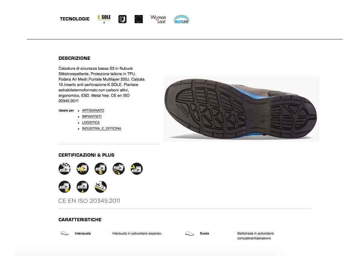 Nubuck Silkidrorepellente. Protezione tallone in TPU. Fodera Air Mesh.Puntale Multilayer 200J. Calzata 10.Inserto anti-perforazione K SOLE. Plantare estraibiletermoformato con carboni attivi, ergonomico, ESD. Metal free