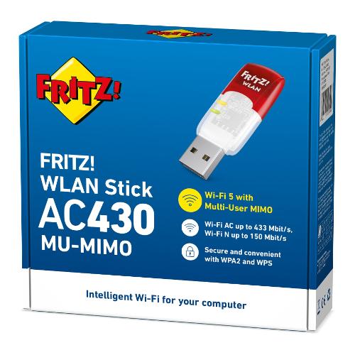 Il FRITZ!WLAN Stick AC 430 MU-MIMO collega velocissimamente il tuo computer al FRITZ!Box ed altri router Wi-Fi mediante una wireless intelligente. Lo stick Wi-Fi trasmette sulla frequenza a 2,4 o 5 GHz, a seconda dell'esigenza del momento. Grazie alla tecnologia multi-user MIMO, lo scambio di dati può essere effettuato contemporaneamente anche tra più dispositivi. La capacità dell'intera rete Wi-Fi risulta meglio sfruttata proprio con l'utilizzo contemporaneo di più dispositivi. La sua struttura compatta, l'installazione particolarmente semplice e la codifica wireless WPA2 ti faranno divertire navigando senza fili.