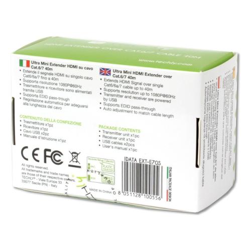L'extender HDMI IDATA EXT-E70S permette di collegare due dispositivi fino a 40 metri tramite cavo rj45 Cat. 6 - 6A - 7, in maniera facile e veloce.