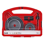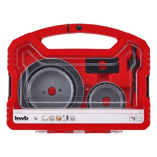 Set completo di seghe a tazza in una robusta valigetta di plastica. Include 5 punte da trapano, perno di lavoro con punta centrale HSS, chiave esagonale e piastra di fissaggio.