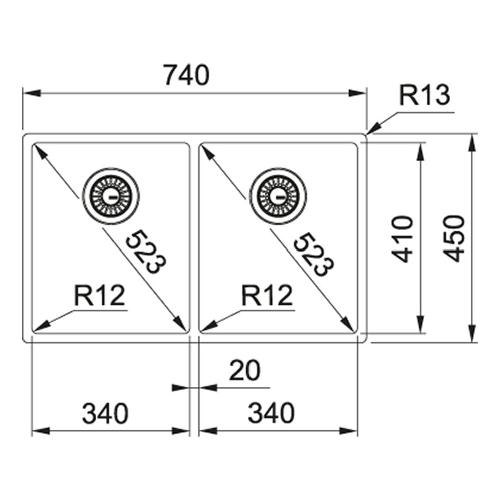 Lavello 2 vasche (74x45cm) Bxx 220 34 34 120 34 34 BOX Inox Spazzolato 127 0370 188