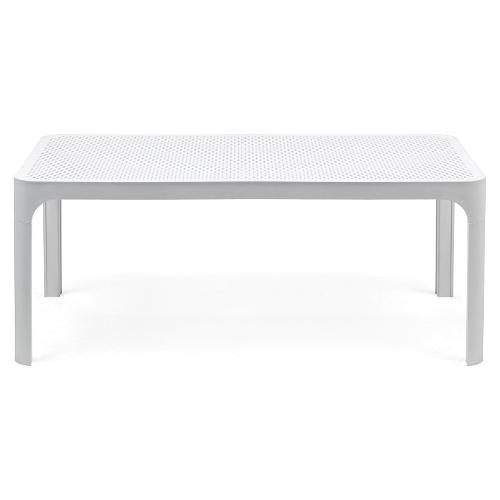 Elegante tavolo da appoggio in resina fiberglass colorata in massa con piano rettangolare caratterizzato da un motivo bucherellato che riprende il leitmotiv di tutta la collezione Net