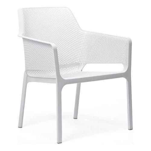 Pluripremiata poltroncina in resina fiberglass corredata di cuscini in tessuto proposti in diverse forme. Decorata da un motivo a fori quadrati e raggiati distribuiti sulla superficie tridimensionale della seduta, Net Relax risulta opaca e piacevole al tatto