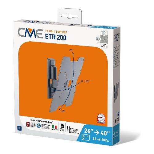 ETR200 è un supporto con braccio adatto a tutte le TV con foratura VESA 50-75-100-200 mm, consente di inclinare lo schermo verticalmente ed orizzontalmente.